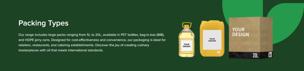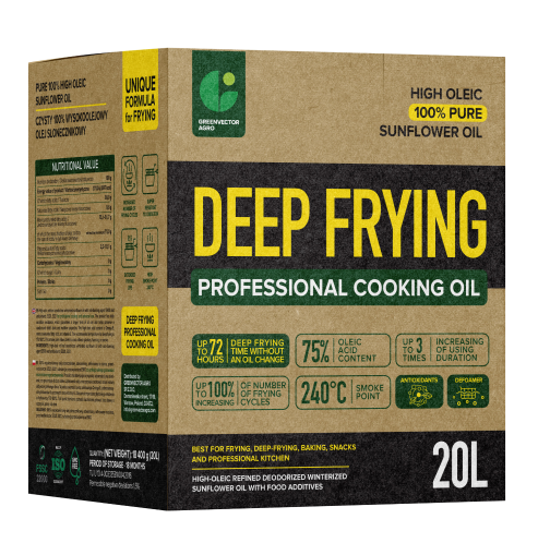Our innovative frying solutions, crafted by our R&D department, are designed for professional kitchen use. We offer diverse products, including deep-frying sunflower, frying rapeseed oil, frying soybean (vegetable) oil, frying blended oils, and deep-frying high-oleic sunflower oil. Available in large formats they convenient for 5L to 20L packing. Moreover, all our products can be customised with private labelling, allowing our customers to align the product with their brand. Our clients includes distributors in the hospitality sector, dealers, and food service establishments.