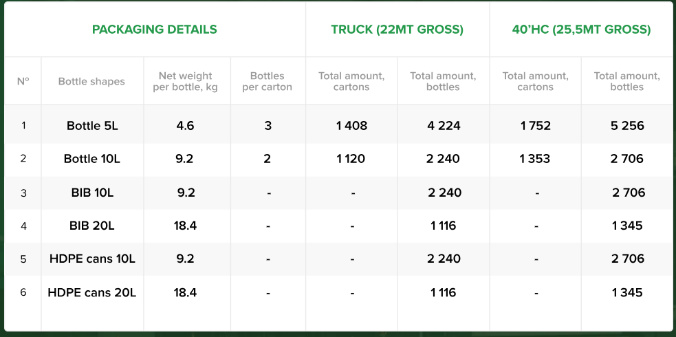 To meet our clients’ needs, we provide service for in-time delivery of our frying oil range in trucks with 32/33 pallets or 40’HC containers loaded with boxes.